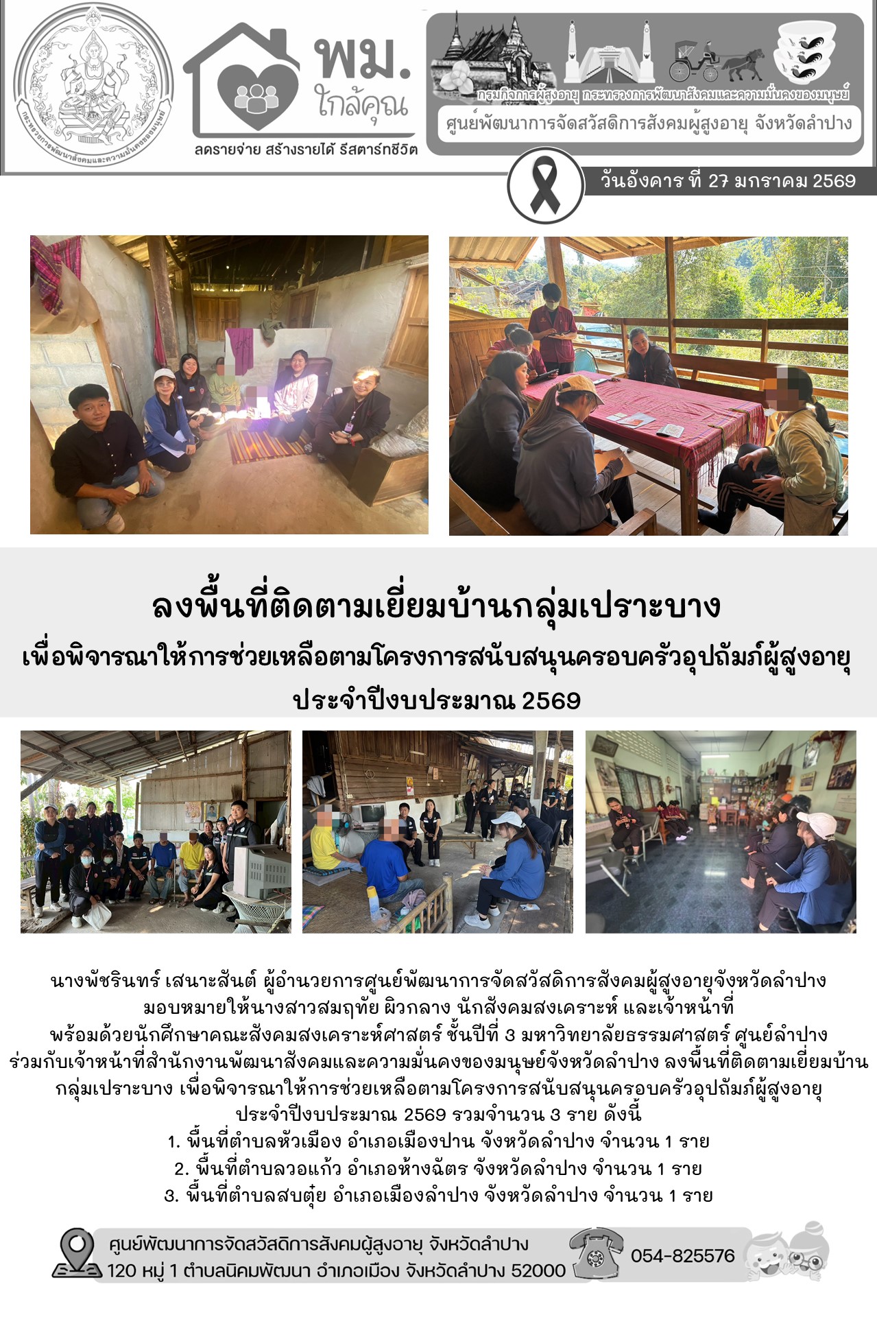 ร่วมกับเจ้าหน้าที่สำนักงานพัฒนาสังคมและความมั่นคงของมนุษย์จังหวัดลำปาง ลงพื้นที่ติดตามเยี่ยมบ้านกลุ่มเปราะบาง เพื่อพิจารณาให้การช่วยเหลือตามโครงการสนับสนุนครอบครัวอุปถัมภ์ผู้สูงอายุ ประจำปีงบประมาณ 2569 รวมจำนวน 3 ราย ดังนี้